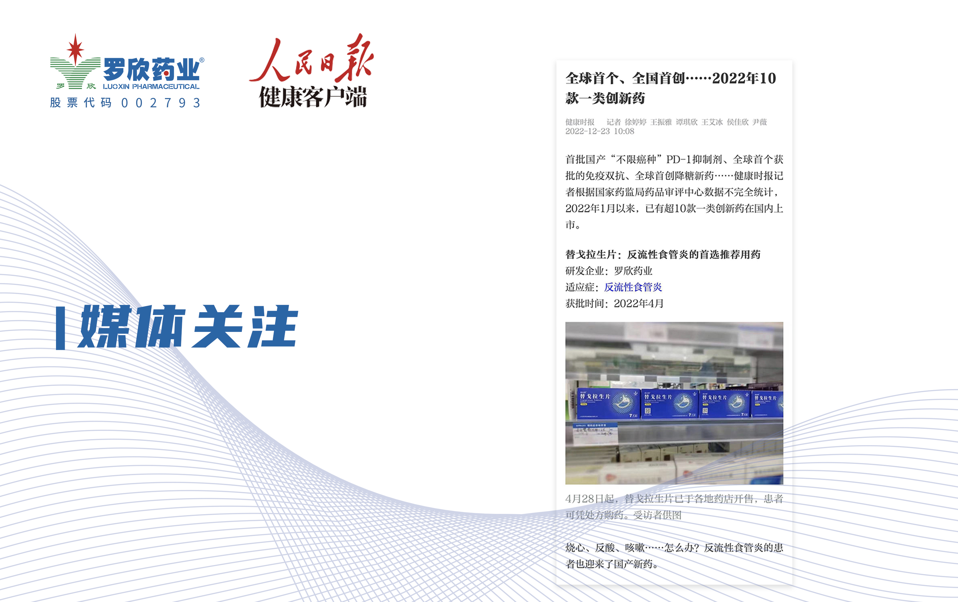 健康时报发布2022年10款一类创新药,罗欣药业自主研发生产的中国首款自研钾离子竞争性酸阻滞剂(P-CAB)药物替戈拉生片获反流性食管炎首选用药推荐