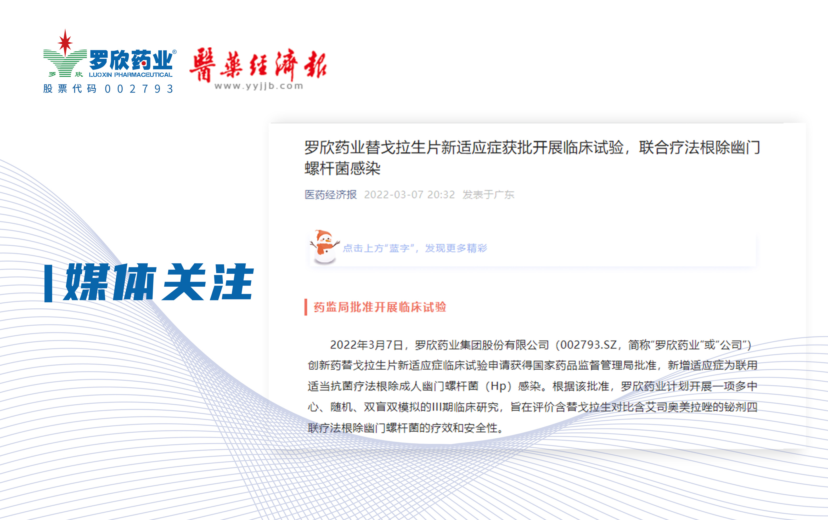 医药经济报报道 | 罗欣药业替戈拉生片新适应症获批开展临床试验,联合疗法根除幽门螺杆菌感染