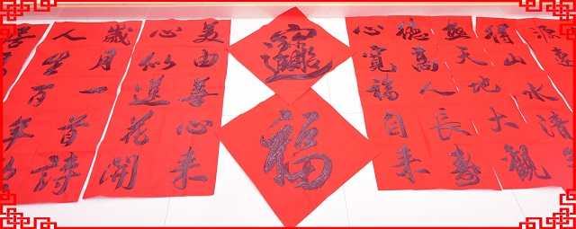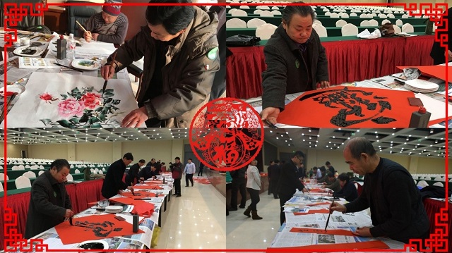 活动现场,书法家们调墨弄笔, 鸾翔凤翥。他们的作品有的行云流水;有的遒美健秀;有的委婉含蓄;有的酣畅潇洒;娴熟的书法技艺,让在场的公司员工们不禁赞叹,同时也被他们认真、执着的精神所感动。他们全身心的投入到作品中,一直到下午两点才休息,共创作春联1500余副,中国画20余幅。一副副带有新年祝福的大红春联,把罗欣会堂渲染的格外喜庆。