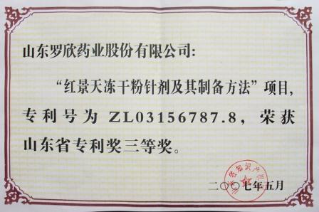 山东罗欣药业股份有限公司“红景天冻干粉针剂及其制备方法”项目,荣获2007年度临沂市专利奖一等奖,山东省专利奖三等奖。