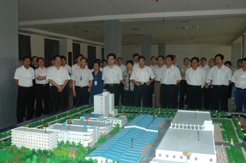 2008年7月14日,市委理论学习中心组读书会暨县(区)域经济观摩会召开之际,临沂市委书记连承敏一行160余人莅临罗欣医药集团医药物流城观摩,对公司的医药贸易中心、仓储配送中心等进行了全面了解。下图为临沂市委书记连承敏(前排右六)率队观看罗欣医药物流城模型。