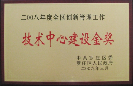 2008年,在中共罗庄区委、罗庄区人民政府的正确领导下,我公司认真落实“工业强区”战略,公司各项工作取得了显著成绩。2009年3月,中共罗庄区委、罗庄区人民政府授予我公司“2008年度全区创新管理工作技术中心建设金奖”荣誉称号。