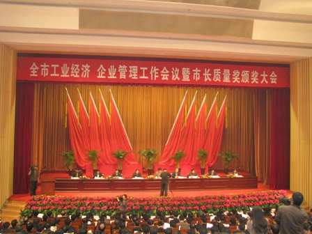 上图为临沂市人民政府召开全市工业经济、企业管理工作会议暨市长质量颁奖大会时的情景