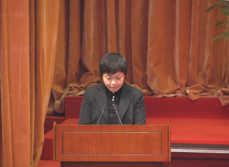 上图为山东罗欣集团副总经理李明华作为先进企业代表上台发言时的情景
