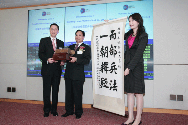 罗欣药业股票上市仪式赠送香港联交所纪念品留影2