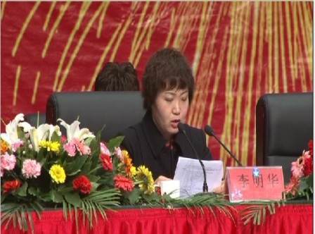 上图为股份集团公司总经理李明华女士宣读《关于表彰2011年度优秀团队和先进个人的决定》