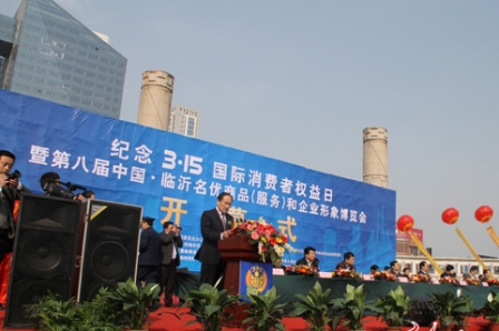 上图为临沂市纪念3.15国际消费者权益日暨第八届中国临沂名优商品(服务)博览会开幕式