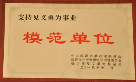 我公司自成为见义勇为基金会理事单位以来,积极响应基金会号召,多次向基金会捐款,用实际行动支持全市见义勇为事业的发展,为建设平安临沂、维护全市和谐稳定贡献了自己的一份力量。此次被评为“支持见义勇为事业模范单位”荣誉称号是市委政法委、市综治委、市见义勇为基金会对我公司见义勇为工作的肯定,也是激励,我们将以此为基础和新的起点,为全市见义勇为事业贡献更多力量。