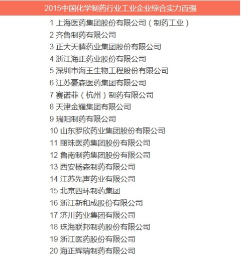 上图为2015中国化学制药行业工业企业综合实力百强前20强榜单